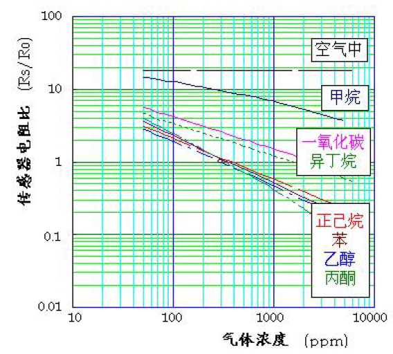 縱坐標以傳感器電阻比(Rs/Ro)表示,Rs,Ro 的定義如下:
