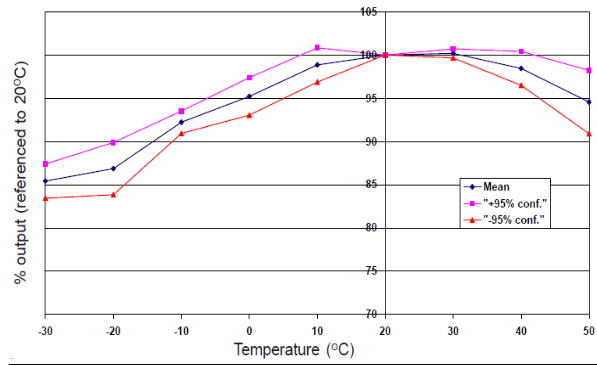 圖 1 顯示了溫度變化所引起的靈敏度變化。 數(shù)據(jù)取自典型批次傳感器。同時(shí)顯示 均值和 ± 95% 置信 區(qū)間。