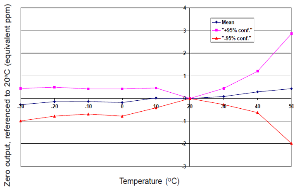 圖 2 顯示從溫度變化所引起的零點(diǎn)變化,以 ppm 表示, 參考 20 °C 時(shí)的零點(diǎn) 。 數(shù)據(jù)取自典型批次傳感器。