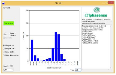 OPC-N2的電子裝置通過SPI接口結(jié)合軟件應(yīng)用,可直接在電腦或安卓手機上直觀地顯示各種尺寸微顆粒物的數(shù)量及分布,使用非常簡便。