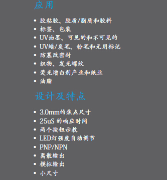 發(fā)光傳感器UVX-30-TP更有可靠地對制造加工過程進行確認,其確認的可靠性比視覺系統(tǒng)確認的可靠性高出十倍。UVXTM傳感器采用我區(qū)經(jīng)檢驗的專利技術,用于對諸多工業(yè)應用領域中使用的UV發(fā)光材料,例如木材、油脂、粘膠、UV油墨及熒光增白劑進行有效檢測。這種傳感器的高靈敏度以及快速的反應能力使得該UVX傳感器適用于高速自動加工領域。耐用的塑料蓋殼和聚碳酸酯鏡片使其結構具有魯棒性,而這種魯棒