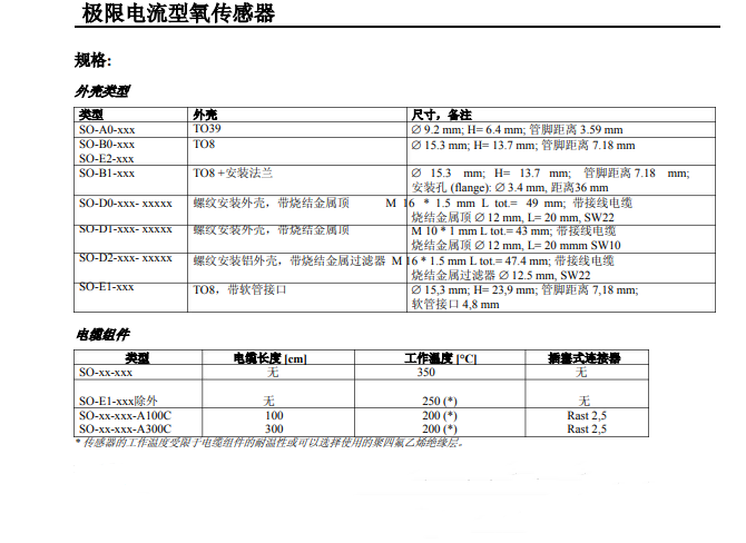 極限電流型氧化鋯氧氣傳感器SO-D1-250-A300C規(guī)格: