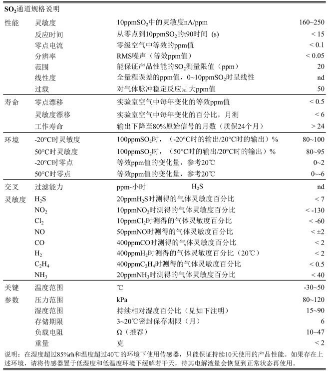 四、SOH-A2 型傳感器的SO2通道規(guī)格說(shuō)明