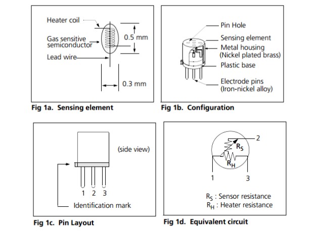 氣體感應(yīng)半導(dǎo)體材料是小珠子的類型, 加熱線圈和電極線嵌入在元件中。 敏感元件安裝在有5 個可以通氣的小孔的金屬盒內(nèi)(Fig1) 。