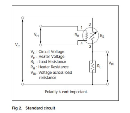 Fig2展示了此產(chǎn)品的標(biāo)準(zhǔn)使用電路。傳感器阻值(Rs)的變化導(dǎo)致了負(fù)載電阻(RL)上的電壓的變化。為了獲取最佳的性能和參數(shù),加熱電壓(VH),電路電壓(Vc)和負(fù)載電阻(RL)的值必須在給定的標(biāo)準(zhǔn)操作條件下的值,具體參數(shù)表在下一頁表述。