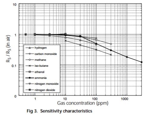 Fig3展示了SP-53A(典型數(shù)據(jù))的靈敏度參數(shù)曲線。氣體傳感器的靈敏度參數(shù)是傳感器阻值和氣體濃度的關(guān)系的體現(xiàn)。基于對數(shù)功能,傳感器阻值的減小,被測氣體濃度隨之增加。SP-53A的靈敏度參數(shù)由以下的參數(shù)詳細(xì)說明。