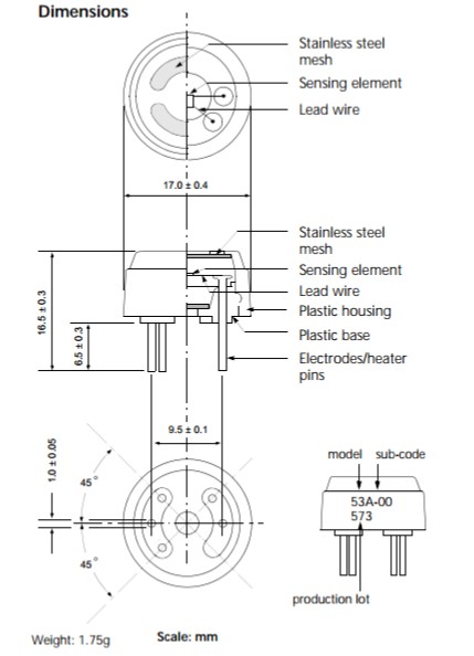 氣體感應(yīng)半導(dǎo)體材料緊貼在鋁基片上,金電極打印在基片上。氧化釕的薄加熱器打印在基片的背面,并且放在塑料封裝中(Fig1)。
