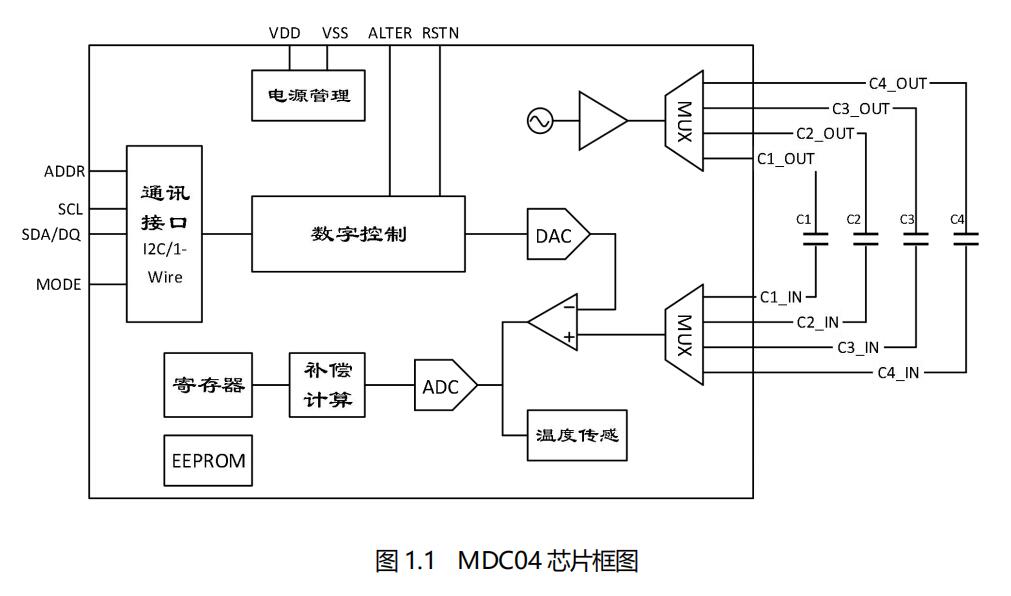 三、高精度數(shù)字電容傳感芯片-MDC04的框圖: