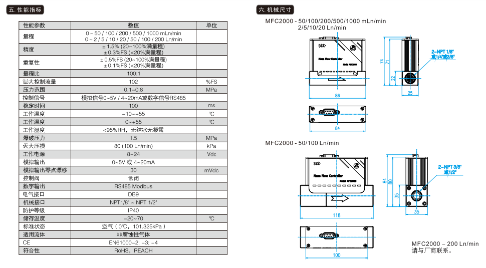 MFC2000質(zhì)量流量控制器的控制范圍可達100:1,可工作在為0.1~0.8MPa,?-10~50C,機械接口NPT 1/8*~NPT1/2",并可定制其他機械接口。