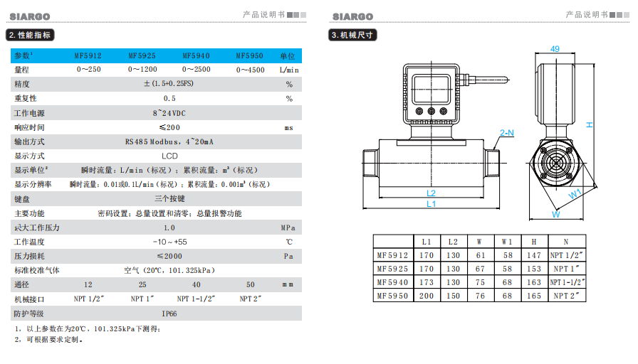 美國Siargo 流量傳感器 MF5900系列 參數(shù):