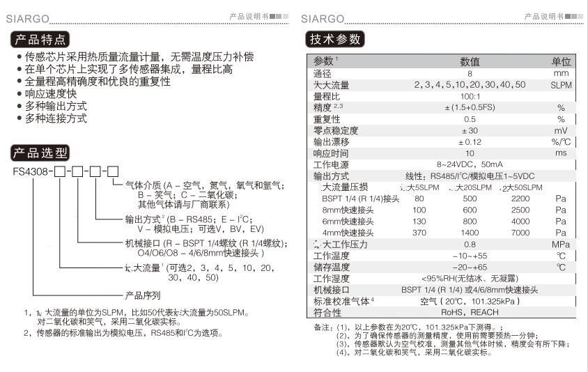 美國(guó)Siargo 氣體質(zhì)量流量傳感器 FS4300系列參數(shù):
