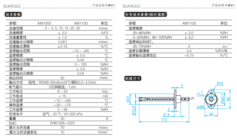 美國(guó)Siargo MEMS風(fēng)速傳感器 HAVC系統(tǒng)?AM1000系列參數(shù):