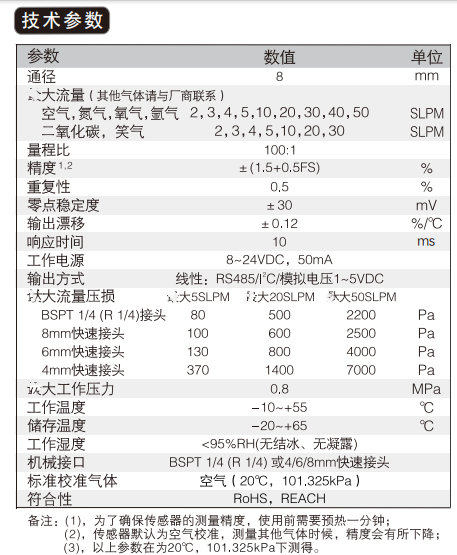 ●傳感芯片采用熱質(zhì)量流量計(jì)量,無(wú)需溫度壓力補(bǔ)償