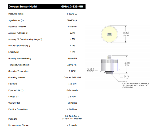 美國AII PPM O2 氧氣傳感器 微量氧傳感器 GPR-12-333-MH 參數(shù):