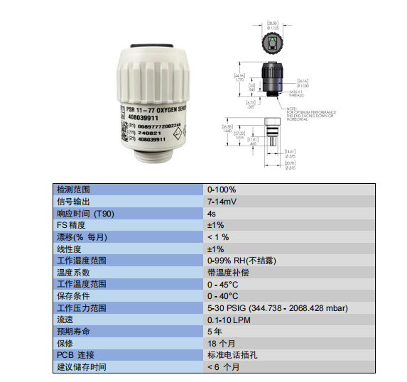 美國(guó)AII O2 氧氣傳感器 PSR-11-77  參數(shù):