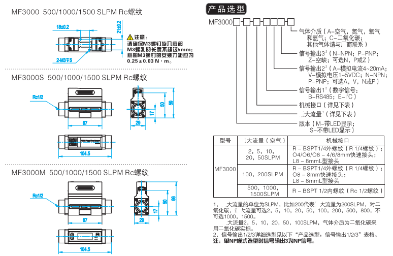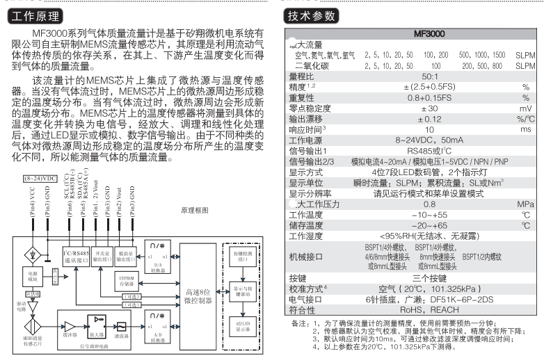 MF3000系列氣體質量流量計能直接測量氣體質量流量,適用于各類清潔、干燥氣體。MF3000測量范圍覆蓋(O~2)SLPM到(O~1500)SLPM,大工作壓力提高到0.8MPa。MF3000提供多種信號輸出,通過RS485或IC數字通訊接口可實現遠程數據采集與設置,并可選擇NPN或PNP開關信號輸出。MF3000同時具備LED數字顯示和按鍵功能,允許用戶在現場調整或查詢流量計的參數。