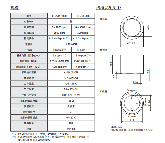 日本figaro 用于檢測(cè)高濃度氨的氣體傳感器 FECS44-5000 參數(shù):