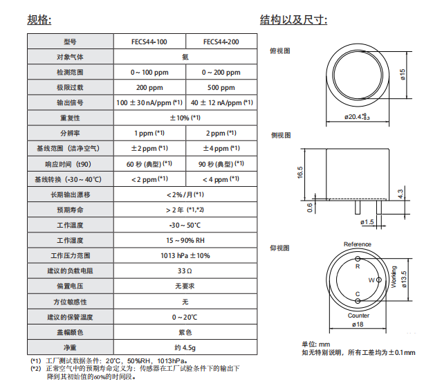 日本figaro 用于檢測低濃度氨的氣體傳感器 FECS44-200 參數(shù):
