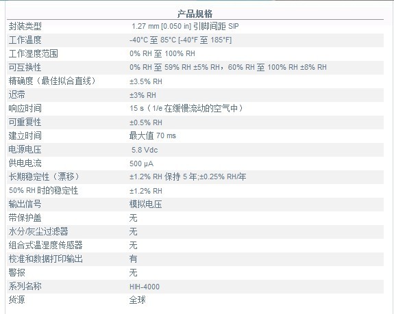 五、HIH4000 系列濕度傳感器產(chǎn)品規(guī)格