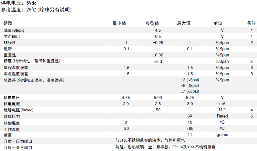 3. 溫度范圍:0°C~40°C,參照溫度:+25°C。量程低于5PSI的產(chǎn)品很大誤差為±2%。